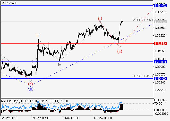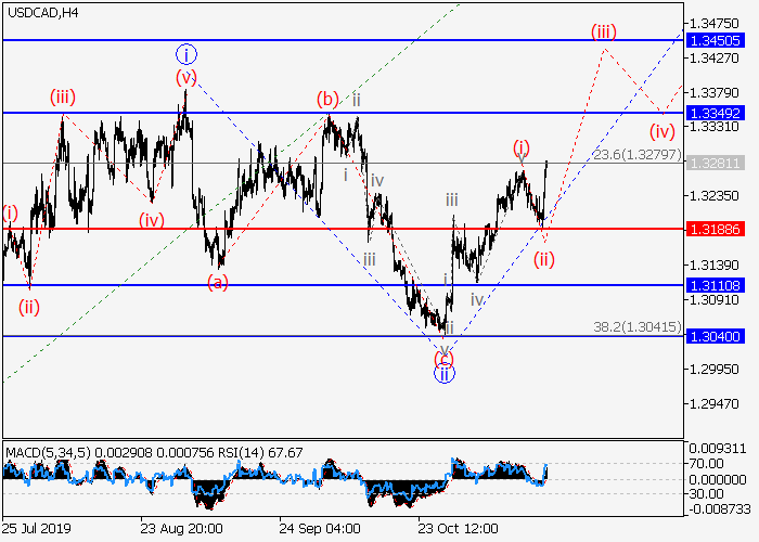 4小时图中,较高水平的下行修正已形成为(3)的1的波ii,(3)的1的第三波iii已开始发展。目前,iii的较低水平(i)的第一波已形成,iii的局部修正(ii)已发展。如果假设正确,价格将会升至 1.3349–1.3450。该情况的关键止损水平为1.3188。