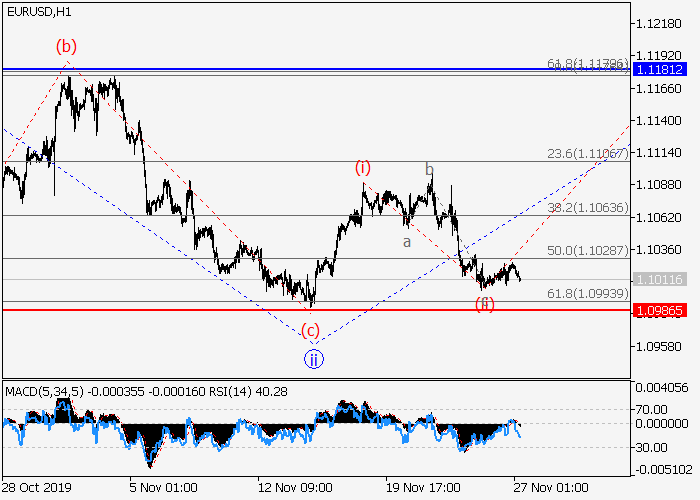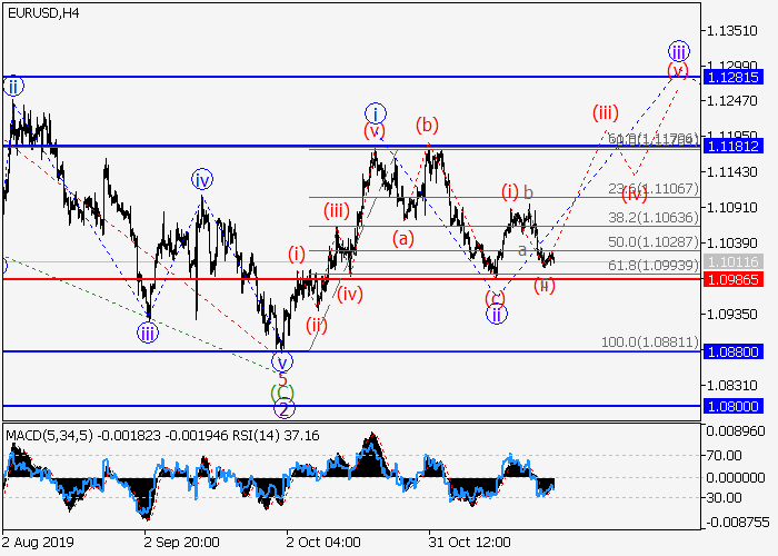 4小时图中,3的(1)的较高水平1的第一波在发展,其中1的局部修正ii已形成。目前,1的第三波iii已开始发展,其中iii的较低水平(i)波已形成,iii的局部修正(ii)已结束。如果假设正确,价格将会升至1.1181–1.1281水平。该情况的关键止损水平为1.0986。
