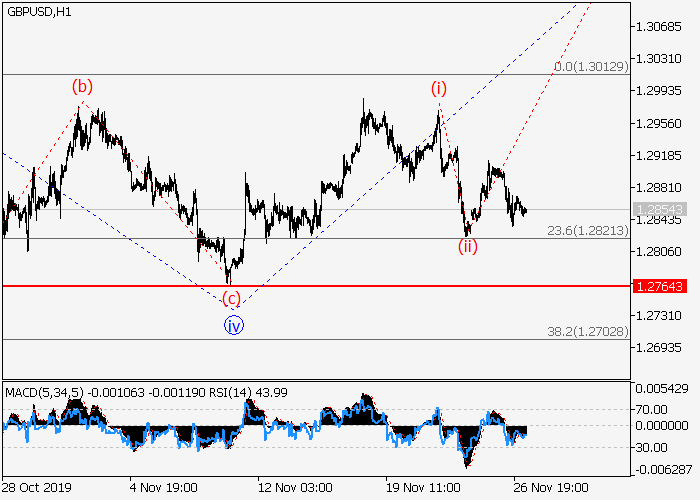 4小时图中,第一波1在较高水平的第三开始波(3)中发展。目前,下行修正已结束为1的波iv,1的第五波v正在发展,其中v的较低水平(i)的第一波已形成,v 的较低水平(ii)的修正已结束。如果假设正确,价格将会升至1.3167–1.3387。该情况的关键止损水平为1.2764。
