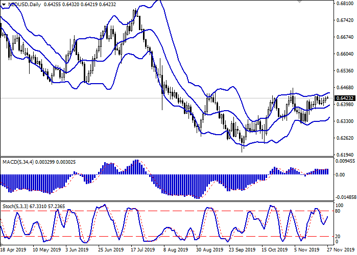 日线图上,布林带正适度增长。价格区间正在收窄,反映出超短期交易的模糊性。平滑异同移动平均线指数在增长,保持弱买入信号(图柱为于信号线以上)。随机指数上行反转,并迅速接近最高点,表明新西兰元可能在极短期内超买。