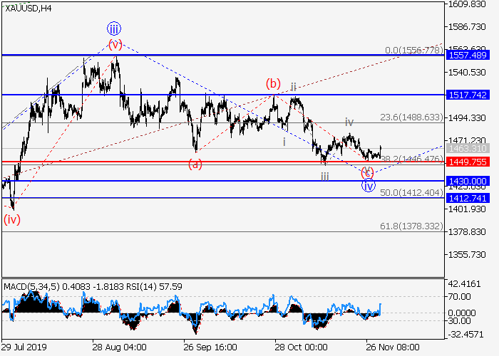 日线图中,上行趋势形成为(B)的较高水平C波,其中C的局部修正iv已结束。目前,iv的波(c)已发展,其中iv的(c)的较低水平v的第五波已形成。如果假设正确,价格将会升至1517.74–1557.48。该情况的关键止损水平为1449.75。