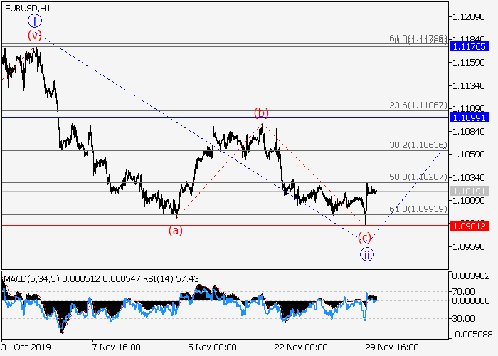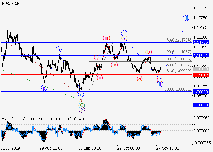 4小时图中,3的(1)的较高水平1的第一波在发展,其中1的较低水平i的第一波已形成。目前,局部修正已发展为1的波ii,已达到62%斐波那契水平。如果假设正确,价格将会升至1.1099–1.1176。该情况的关键止损水平为1.0981。