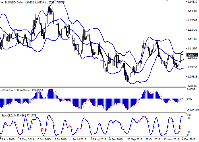 日线图中,布林带呈适度增长。价格区间在此基础上略有扩大,为看涨趋势开辟了一条通往局部新高的通道。平滑异同移动平均线指标正在增长,保持适度买入信号(位于信号线之上)。随机指标达到高点后,又向水平方向反转,这表明了超短期内可能会因欧元超买而形成修正动态。