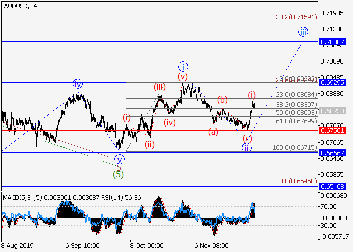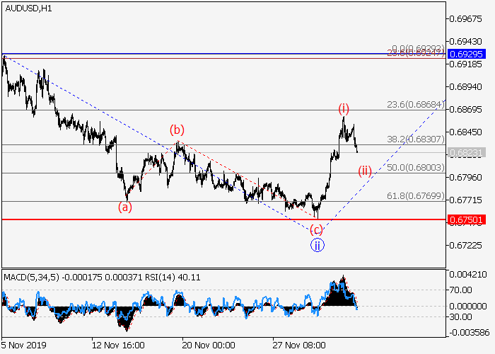 4小时图中,(A)的较高水平1的第一波在发展,其中1的第一波i已形成。目前,局部修正已结束为1的波ii,1的波iii已开始发展,其中入市栋梁已形成为iii的较低水平(i)的第一波。如果假设正确,iii的修正(ii)结束后,价格将会升至0.6929–0.7080。该情况的关键止损水平为0.6750。