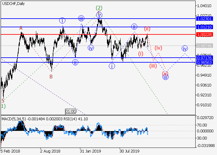 日线图中,较高水平的上行修正已发展为1的第二波ii,1的第三波iii已开始形成。目前,iii的较低水平(ii)已结束,iii的波(iii)已开始形成。如果假设正确,价格将会跌至0.9717–0.9656。该情况的关键止损水平为1.0022。