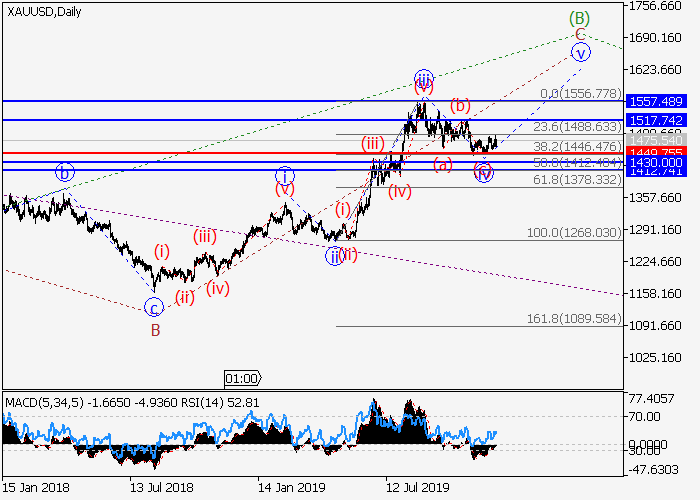 日线图中,上行趋势形成为(B)的较高水平C,其中C的局部修正iv已结束。目前,C的第五波v已开始形成,其中v的较低水平(i)的第一波正在发展。如果假设正确,价格将会升至1517.74–1557.48。该情况的关键止损水平为1449.75。