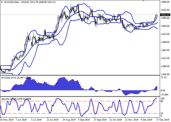 日线图中,布林带呈下降趋势。价格区间仍由下扩大,表明在12月17日的反弹之后,仍存在强看跌潜力。平滑异同移动平均线指标勉强上行反转,位于零线水平附近,保持之前的卖出信号(位于信号线以下)。随机给出类似动态,且已在快速增长,这表明在超短期内可能会发展修正增长。