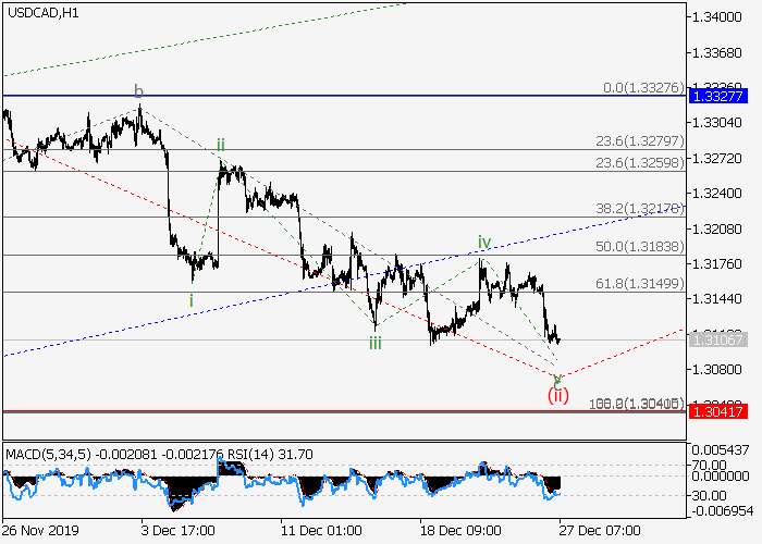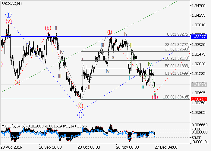 4小时图中,较高水平的修正已结束为(3)的1的波ii,1的波iii已开始形成。目前,iii的较低水平(i)的第一波已形成,iii的局部下行修正发展正在结束。如果假设正确,价格将会升至1.3327–1.3498。该情况的关键止损水平为1.3041。
