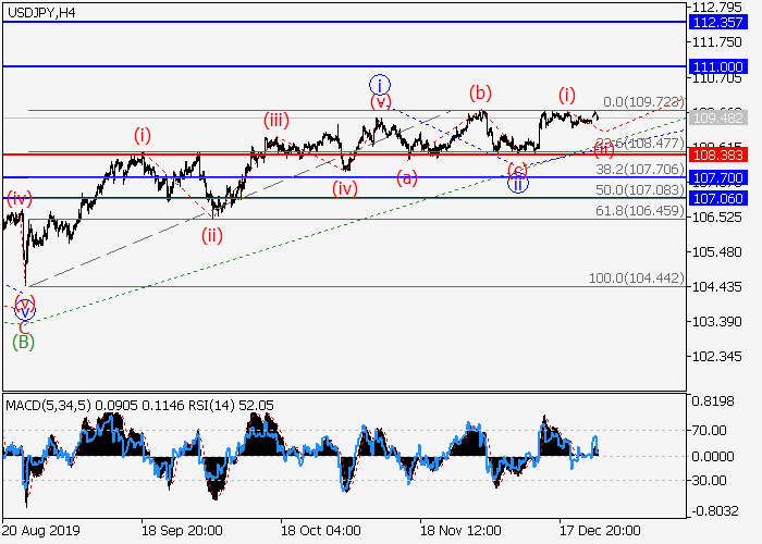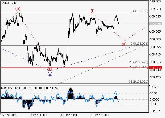 4小时图中,较高水平的波(C)在发展,其中(C)的1的第一波i已形成,(C)的1的局部修正ii已结束。目前,1的波iii已开始形成。如果假设正确,价格将会升至111.00–112.35。该情况的关键止损水平为108.38。