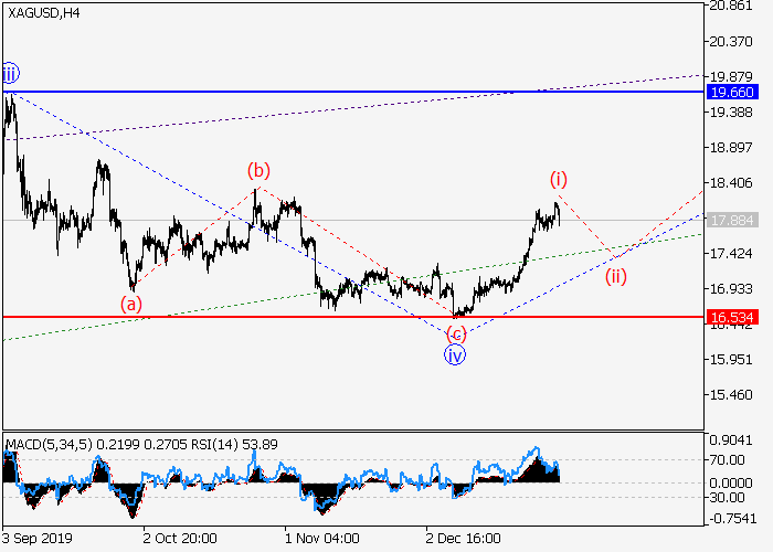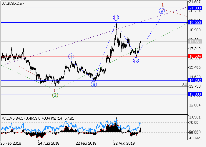 日线图中,(3)的较高水平1的第一波形成,其中1的波v已开始发展。目前v的较低水平(i)的第一个入市波已形成。如果假设正确,v的局部修正(ii)结束后,价格将会升至19.66–21.00。该情况的关键止损水平为16.53。