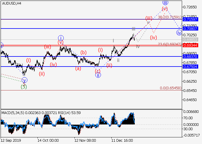 日线图中,(A)的较高水平1的第一波在发展,其中1的第一波i已形成,1的修正波ii已结束。目前,1的第三波iii正在形成,其中较低水平的iii的波(iii)正发展为动量。如果假设正确,价格将会升至0.7080–0.7159。该情况的关键止损水平为0.6934。