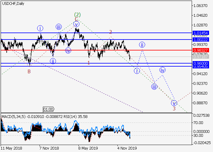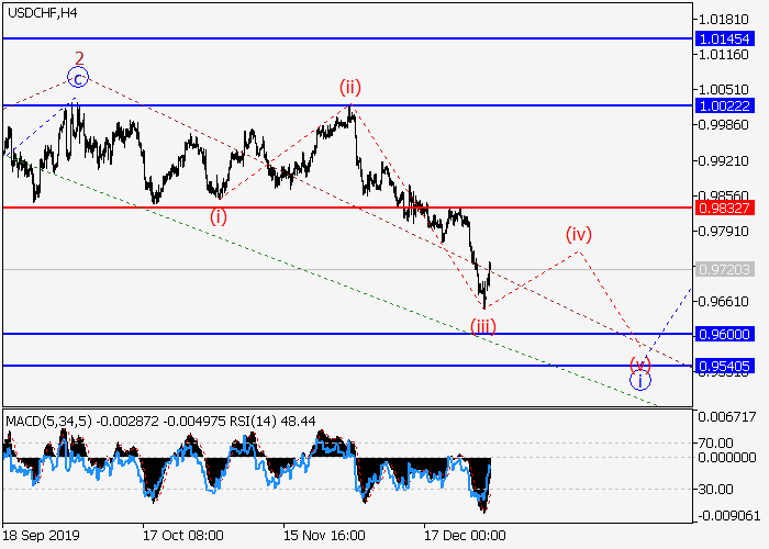 日线图中,(3)的较高水平3的第三波发展,其中3的波i形成。目前,i的较低水平(iii)已发展,局部修正正形成为iii的波(iv)。如果假设正确,修正结束后,该货币对将会跌至0.9600–0.9540。该情况的关键止损水平为0.9832。
