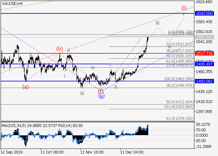 日线图中,上行趋势正形成为(B)的较高水平C,其中C的局部修正iv已完成。目前,C的第五波v正在形成,v的较低水平(i)的第一波正作为其中一部分发展。如果假设正确,价格将会继续升至1600.00–1650.00。该情况的关键止损水平为1517.71。