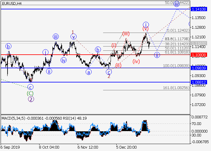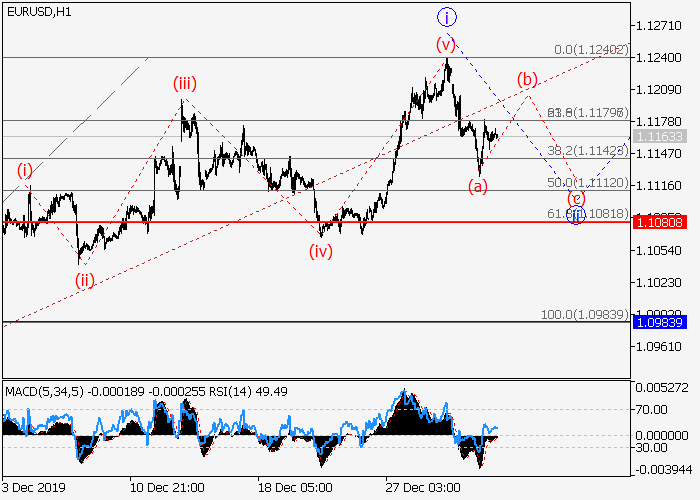 4小时图中,3的较高水平(1)的第一波继续发展,其中(1)的第三波3已形成。目前,3的较低水平i的第一波已完成,下行修正已发展为3的波ii。如果假设正确,上涨完成后,该货币对将会继续升至1.1410–1.1650。该情况的关键止损水平为1.1080。