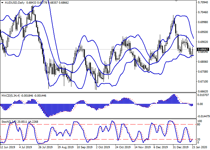 日线图中,布林带呈活跃下降趋势。价格区间正在收窄,反映出短期/超短期趋势的急剧变化。平滑异同移动平均线上行反转,保持卖出信号(位于信号线下方)。随机指标从低点反弹,预示着在超短期内将出现修正性增长。