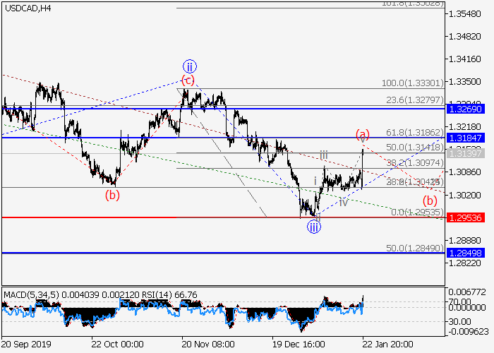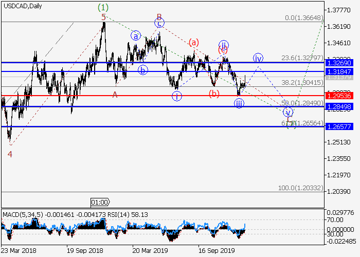 日线图中,下行修正形成为波(2),其中(2)的波C发展。目前,上行修正正发展为C的波iv,其中iv的波(a)已形成。如果假设正确,iv的修正(b)结束后,价格将会升至1.3184–1.3269。该情况的关键止损水平为1.2953。