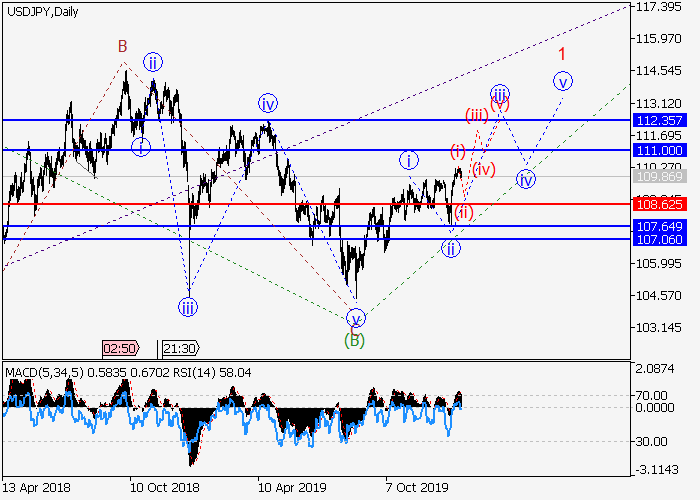 日线图中,(C)的较高水平1的第一波形成。目前,1的较低水平iii波已开始形成,其中iii的较低水平(1)的第一波已形成。如果假设正确,iii的修正(ii)结束后,价格将会升至111.00–112.35。该情况的关键止损水平为108.62。