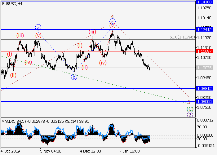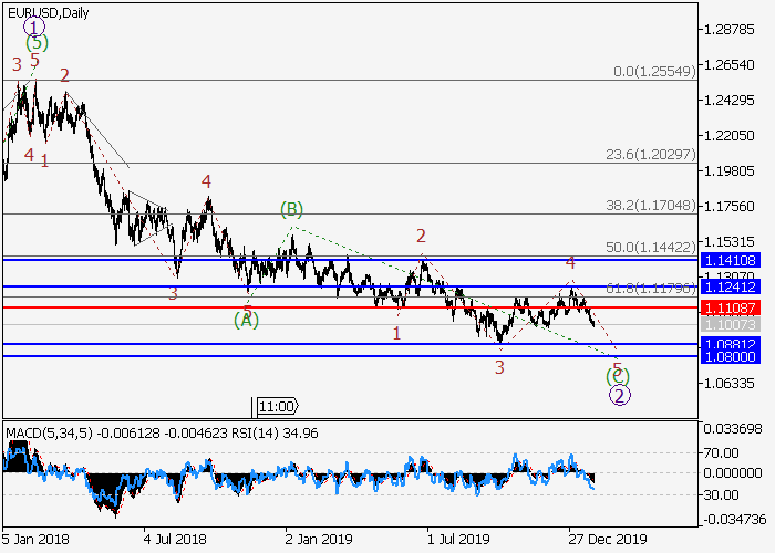 日线图中,较高水平的下行修正发展为波2,其中2的波(C)形成。目前,上行修正已结束为(C)的较低水平4的第四波,(C)的第五波5正在形成。如果假设正确,价格将会跌至1.0881–1.0800。该情况的关键止损水平为1.1108。