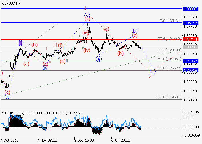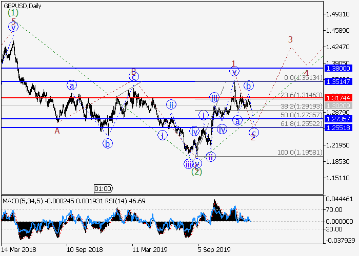 日线图中,较高水平的下行修正已发展为波(2),第三波(3)已开始形成。目前,(3)的较低水平1的第一波已形成,下行修正正发展为(3)的波2,其中2的波c正在形成。如果假设正确,价格将会跌至1.2735–1.2551。该情况的关键止损水平为1.3174。