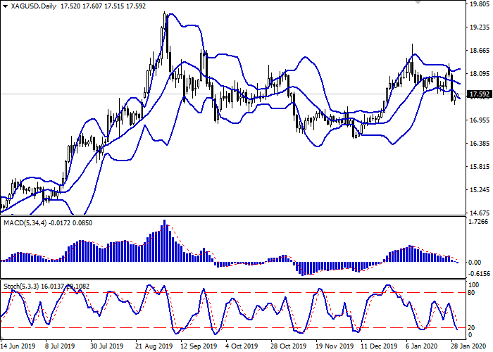 日线图中布林带呈负面动态。价格范围略有扩大,但就目前的市场活动水平来说,仍不够宽敞。平滑异同移动平均线下跌,保持弱卖出信号(位于信号线下)。随机指标呈类似动态,保持下行,接近其低点。目前的指标读数没有很好地反映出该工具正在出现的上升趋势,但表明超短期内白银超卖的风险在增加。