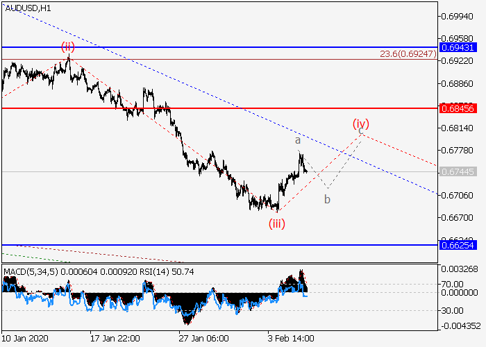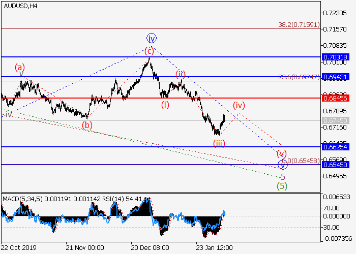 4小时图中,(5)的较高水平5的第五波继续发展。目前,5的较低水平v的第五波已形成,其中v的波(iii)已形成,局部修正正发展为v的波(iv)。如果假设正确,修正结束后,价格将继续下跌至0.6625–0.6545。该情况的关键止损水平为0.6845。