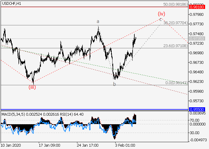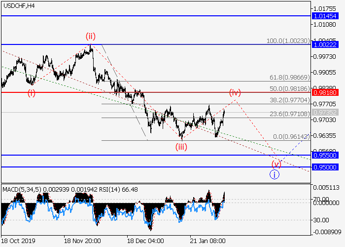 4小时图中,3的第一波i正发展为较高水平3的第三波。目前,局部修正正发展为i的第四波(iv),其中i的波c已形成。如果假设正确,修正完成后,价格将会继续跌至0.9550–0.9500。该情况的关键止损水平为0.9818。