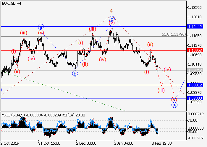 日线图中,较高水平的下行修正发展为波2,其中2的波(C)形成。目前,上行修正已结束为(C)的较低水平4的第四波,(C)的第五波5正在形成,其中下行动量正发展为5的波a。如果假设正确,价格将会跌至1.0881–1.0800。该情况的关键止损水平为1.1095。