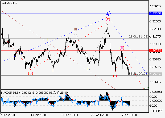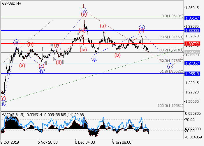 4小时图中,(3)的较高水平1的第一波已发展,下行修正形成为(3)的波2。目前,2的波b一发展,2的波c已开始形成,其中c的波(iii)正在发展。如果假设正确,价格将会跌至1.2735–1.2551。该情况的关键止损水平为1.3072。