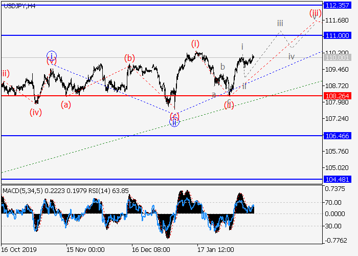 日线图中,C的较高水平(1)的第一波正形成,其中1的波iii已开始。目前,iii的较低水平(i)的第一波已形成,下行修正作为iii的(ii)波已完成发展,iii的波(iii)已开始。如果假设正确,价格将会继续上涨至111.00–112.35。该情况的关键止损水平为108.26。