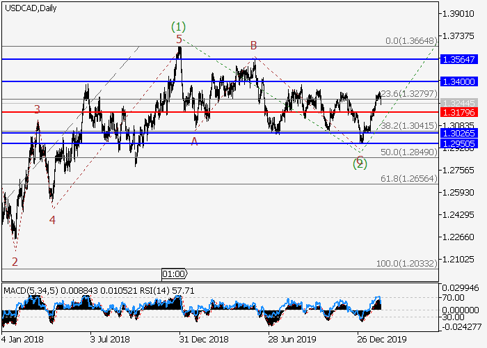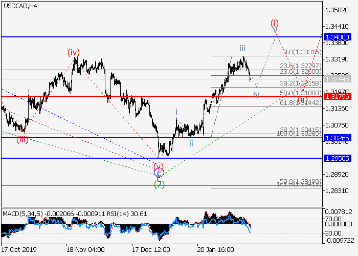 日线图中,较高水平的下行修正已作为第五波(2)形成,波(3)已开始发展。目前,(3)的1的i的较低水平(i)的第一个入市波已形成,其中(i)的波iii已完成,局部修正正发展为(i)的波iv。如果假设正确,修正结束后,价格将会继续上涨至1.3400–1.3564。该情况的关键止损水平为1.3179。