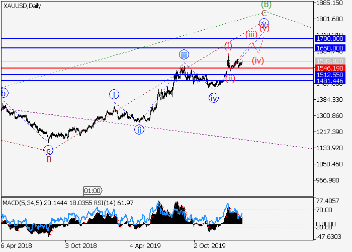 日线图中,上行趋势形成为(B)的较高水平C波,其中C的局部修正iv已结束。目前,C的第五波v正在发展,其中v的较低水平(iii)的第三波正在发展。如果假设正确,价格将会升至1650.00–1700.00。该情况的关键止损水平为1546.19。
