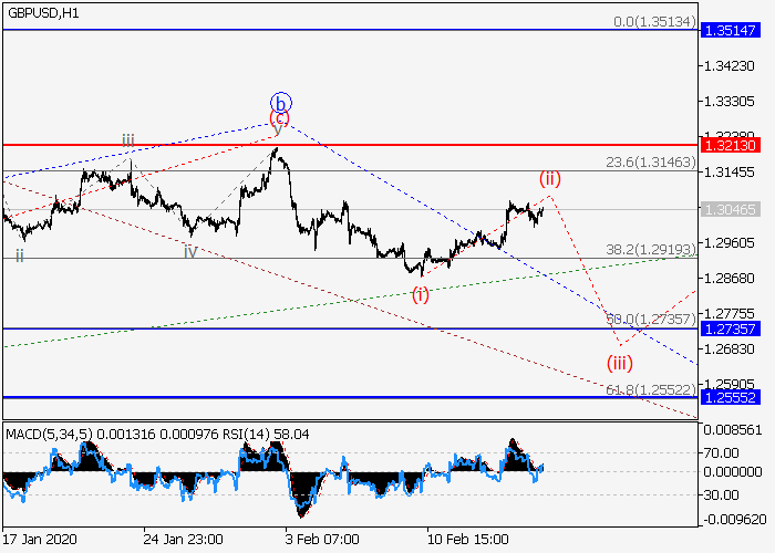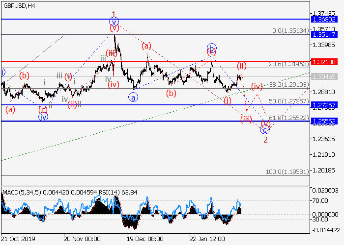 4小时图中,(3)的较高水平1的第一波已发展,下行修正形成为(3)的波2。目前,2的波c正在发展,其中局部修正正发展为c的波(ii)。如果假设正确,修正结束后,价格将会跌至1.2735–1.2555。该情况的关键止损水平为1.3213。
