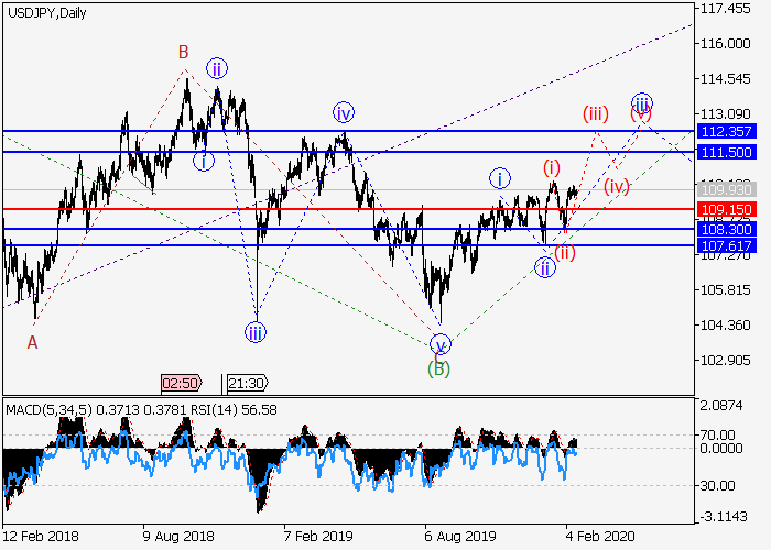 日线图中,C的较高水平(1)的第一波正形成,其中1的波iii正在发展。目前,iii的较低水平(iii)的第三波开始形成,其中(iii)的局部修正ii正完成。如果假设正确,价格将会继续上涨至111.50–112.35。该情况的关键止损水平为109.15。