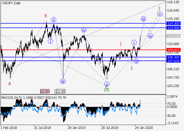 日线图中,(C)的较高水平3的第三波形成,其中3的波iii在发展。目前,iii的较低水平(iii)的第三波正在形成。如果假设正确,价格将会升至113.50–114.30。该情况的关键止损水平为109.62。
