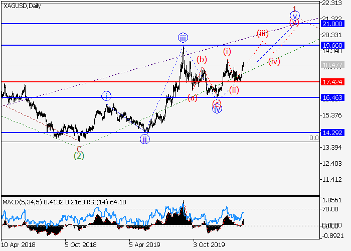 日线图中,(3)的较高水平1的第一波已形成,其中1的波v开始发展。目前,v的较低水平(i)的第一进入波已形成,v的波(ii)为已结束的局部修正。如果假设正确,价格将升至19.66–21.00。该情况的关键止损水平为17.42。