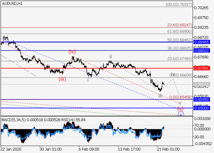 4小时图中,(5)的较高水平5的第五波已发展,其中5的波v已形成。目前,v的较低水平(v)的第五波正在发展,其中,(v)的波iii已形成,修正正在发展成为(v)的波iv。如果假设正确,该货币对将跌至0.6545–0.6500。该情况的关键止损水平为0.6709。