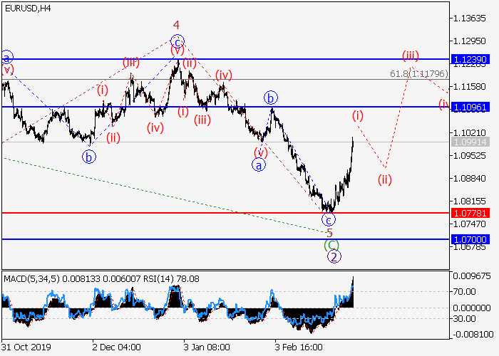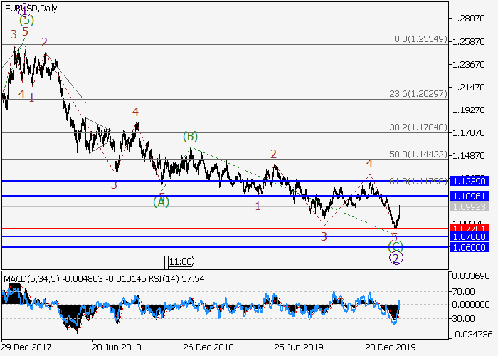 日线图中,较高水平的下行修正已发展为第二波2,其中2的波C已形成有限对角三角形。目前,波3已开始发展,其中较低水平(i)的第一个入市波正形成。如果假设正确,该货币对价格将会升至1.1096–1.1239。该情况的关键止损水平为1.0778。