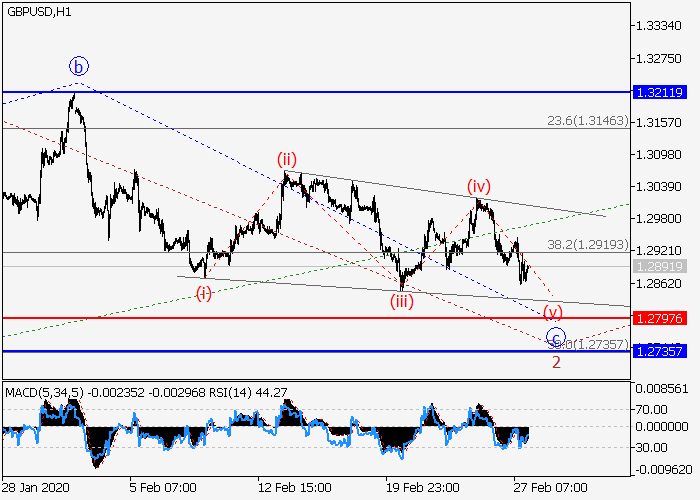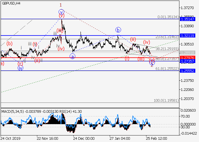 日线图中,(3)的较高水平1的第一波已形成,下行修正发展为(3)的波2已结束。目前,2的波c正结束形成为有限对角三角形,其中c的波(v)的正在收尾。如果假设正确,修正结束后,价格将会升至1.3211–1.3514。该情况的关键止损水平为1.2797。