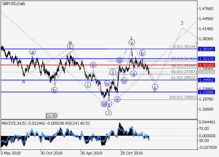 日线图中,(3)的较高水平1的第一波已形成,下行修正发展为(3)的波2。目前,2的波c正形成,其中c的波(iii)正在发展。如果假设正确,价格将会跌至1.2555–1.2185。该情况的关键止损水平为1.3018。