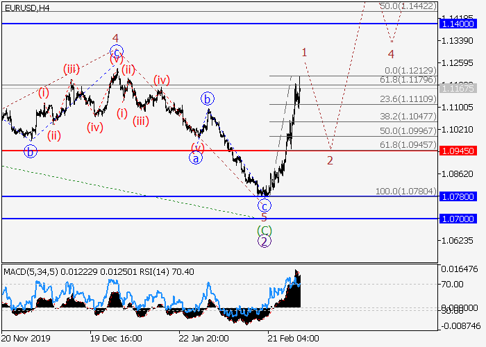 日线图上,较高水平的下行修正已发展为第二波2,其中2的波(C)已形成有限对角三角形。目前,波3一开始发展,其中3的(1)的较低水平1的第一个入市波正结束形成。如果假设正确,(1)的局部修正2结束后,该货币对将会升至1.1400–1.1567。该情况的关键止损水平为1.0945。