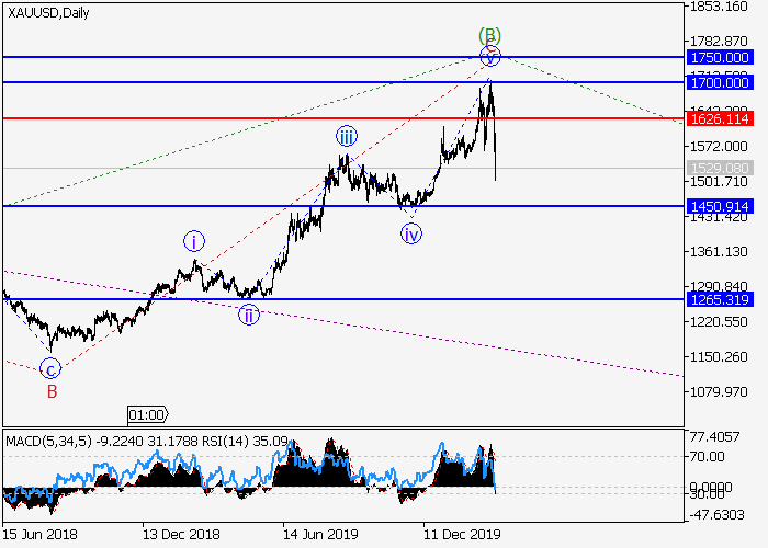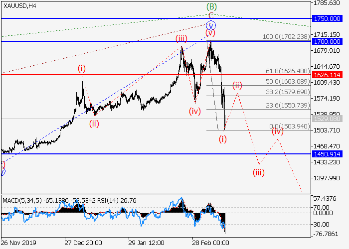 日线图中,较高水平的上行修正已形成为波(B),其中上行动量已形成为(B)的波C。目前,波(C)已开始发展,其中较低水平(i)的第一个入市波已形成。如果假设正确,修正(ii)结束后,价格将会跌至1450.91–1265.31。该情况的关键止损水平为1626.11。