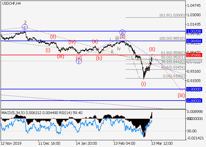 4小时图中,(3)的较高水平3的第三波发展,其中较低水平3的波iii形成。目前,局部修正正结束形成为iii的第二波ii。如果假设正确,修正结束后,价格将会跌至0.9000–0.8800。该情况的关键止损水平为0.9598。