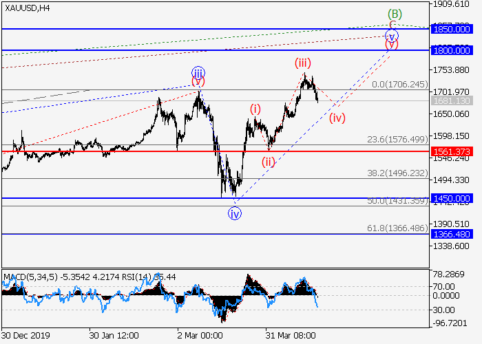 日线图中,较高水平的上行修正形成为波(B),其中(B)的波C在发展。目前,C的较低水平iii的第三波已形成,局部修正已结束为C的第四波iv,C的波v正在发展,其中v的波(iv)正在形成。如果假设正确,价格将会升至1800.00–1850.00。该情况的关键止损水平为1561.37。