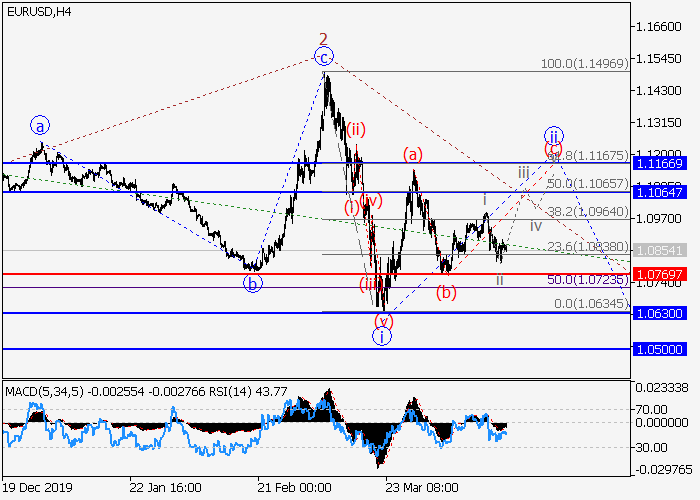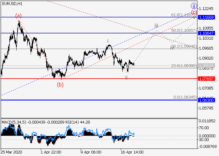 4小时图中,较高水平3的第三个下行波在发展,其中3的第一波i已形成。目前,上行修正正发展为3的第二波ii,其中ii的波(b)已形成,ii的波(c)正在发展。如果假设正确,价格将会升至1.1064–1.1166。该情况的关键止损水平为1.0769。