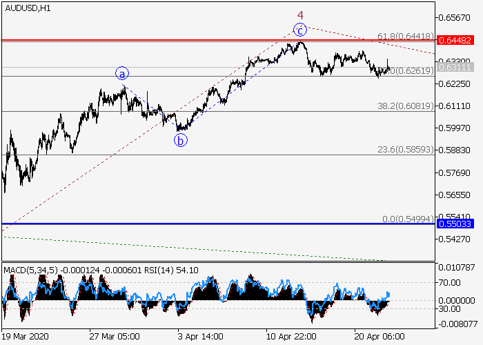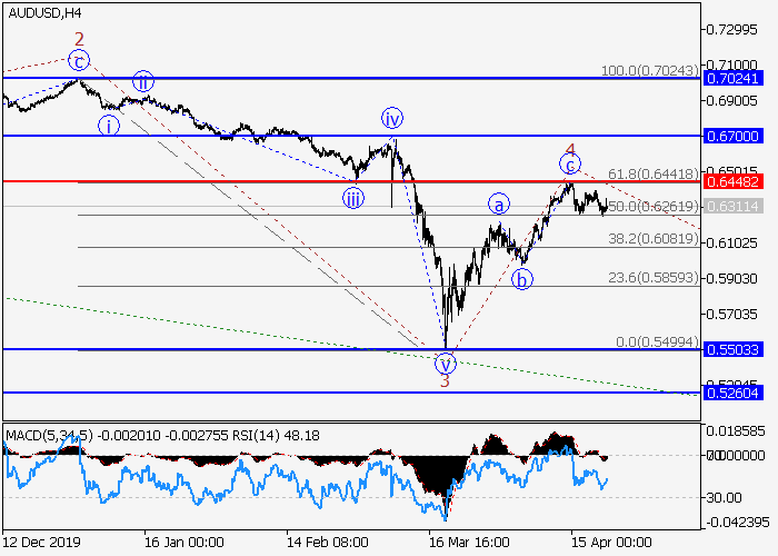 4小时图中,下行趋势发展为较高水平(C)波,其中(C)的波3已形成。目前,局部修正已发展为(C)的第四波4,其中4的波c已形成,(C)的波5正开始发展。如果假设正确,价格将会跌至0.5503–0.5260。该情况的关键止损水平为0.6448。
