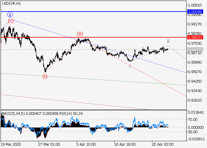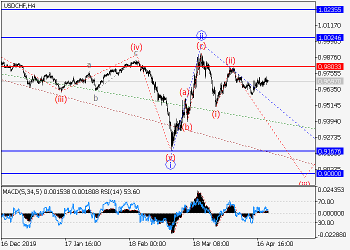 4小时图中, (3)的较高水平3的第三波在发展,其中3的波i已形成,修正结束为3的波ii。目前,3的波iii已开始发展,其中3的较低水平(iii)波正在发展。如果假设正确,价格将会跌至0.9167–0.9000。该情况的关键止损水平为0.9803。
