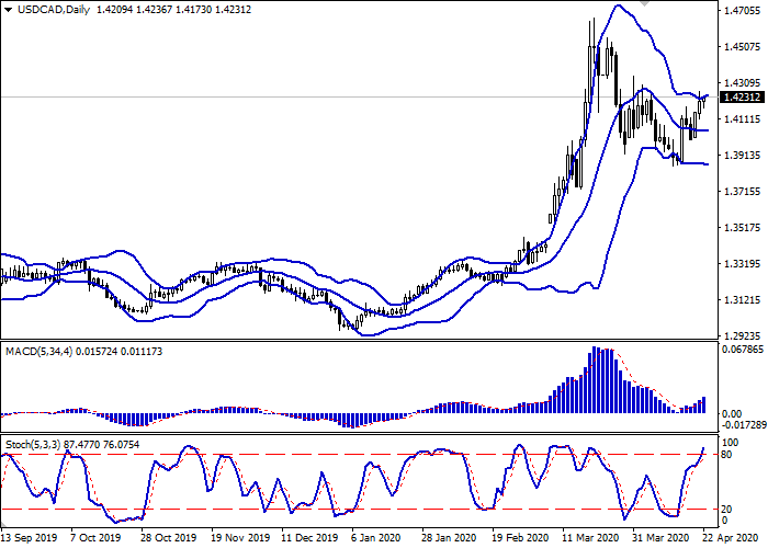 日线图中,布林带呈平面动态。价格区间从上方开始扩大,但目前还未及看涨发展趋势。平滑异同移动平均线图柱正在增长,保持稳定的买入信号(位于信号线之上)。随机指标呈类似动态,但正接近其高点,并表明超短期内超买工具。