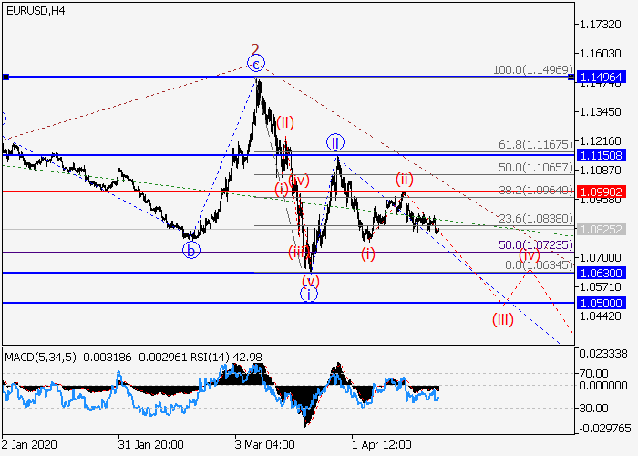 4小时图中,较高水平3的下行第三波继续发展,其中3的第一波i已形成,修正已结束为3的波ii。目前,3的第三波iii已开始发展,其中较低水平的iii的波(iii)形成。如果假设正确,价格将会继续下跌至1.0630–1.0500。该情况的关键止损水平为1.0990。