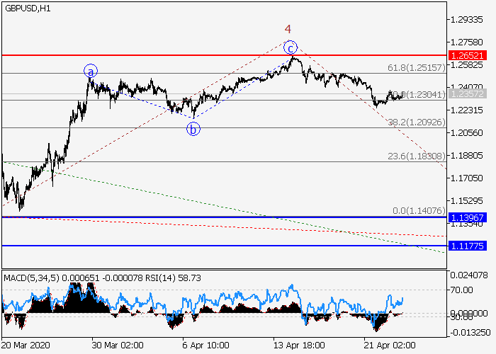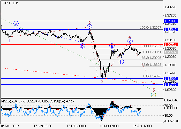 4小时图中,V的较高水平(3)的第三波继续发展,其中上行修正作为(3)的波4已完成。目前,(3)的第五波5已开始发展,如果假设正确,价格将会继续跌至1.1396–1.1175。该情况的关键止损水平为1.2652。