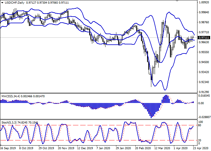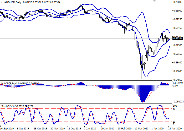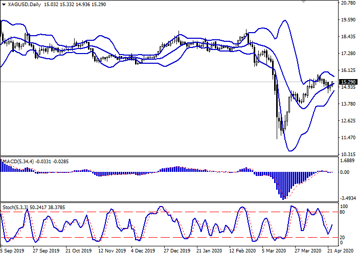 日线图上,布林带在水平面上反转。价格区间迅速缩小,表明短期内交易呈平面动态。平滑异同移动平均线增长,保持弱买入信号(图柱位于信号线之上),并试图在零线之上进行盘整。随机指标在超卖区的正式边界20点附近急剧上行反转。